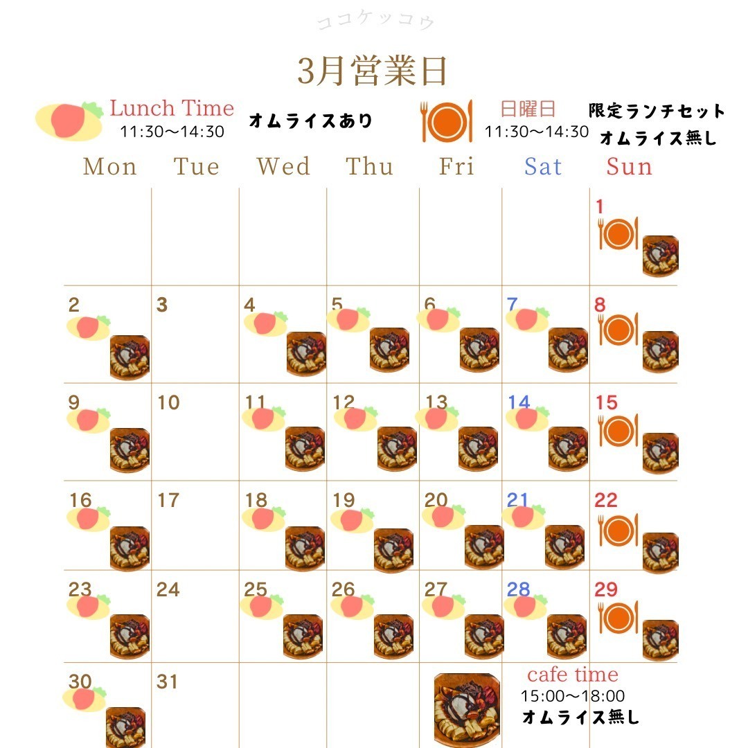 ココケッコウのランチタイムでは通常メニューのオムライスの他、月替わりオムライスが用意されています!