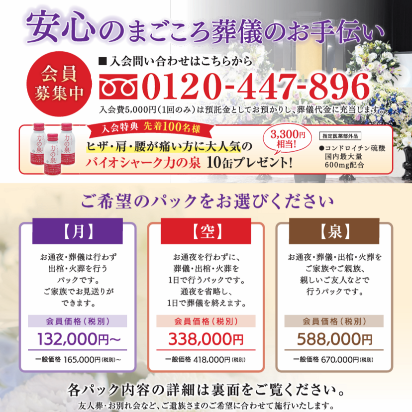 より簡略化された『お預かり葬プラン/88,000円(税込)~』、一般葬・家族葬・一日葬の取り扱いもございます。