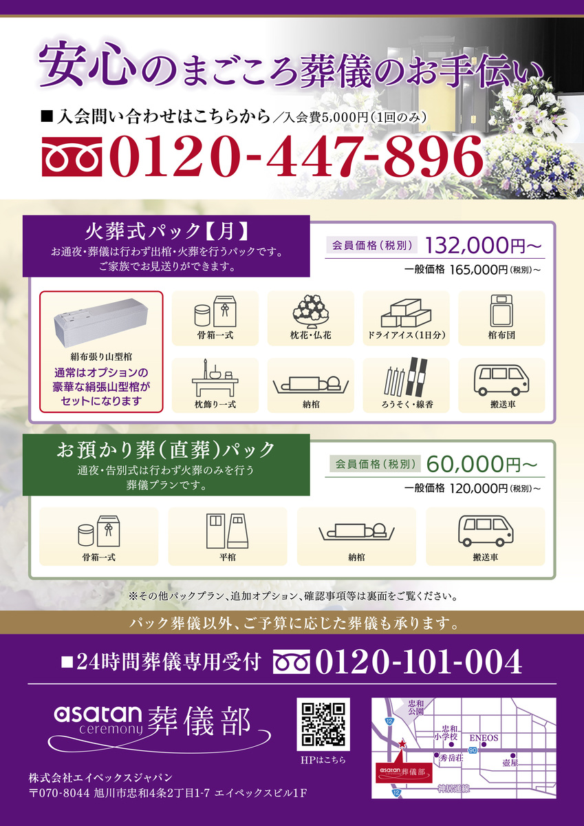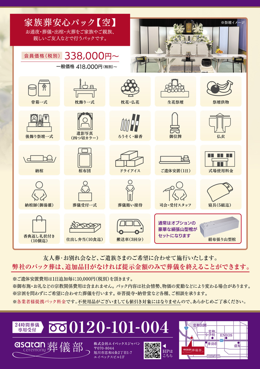 旭川市に、安心価格の火葬式プランをメインとした『あさたん葬儀部』がオープンしました。