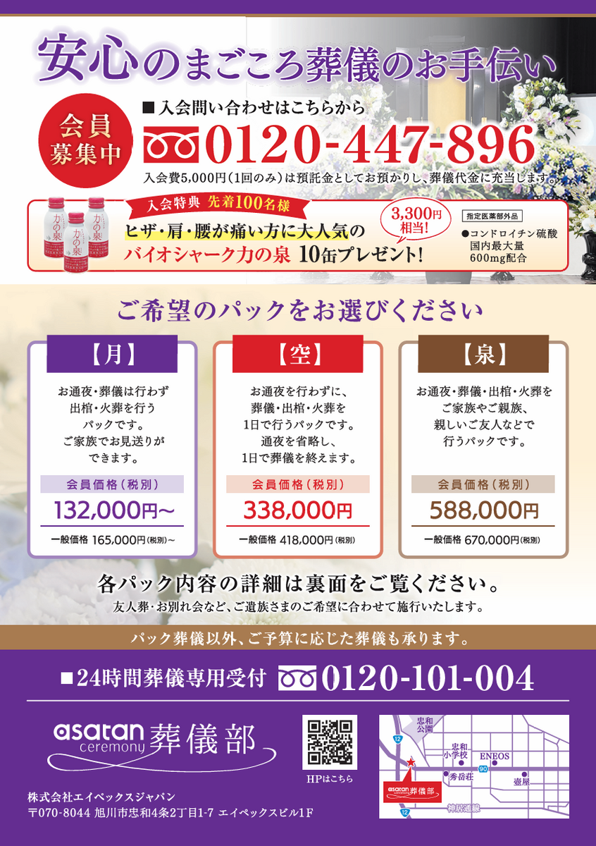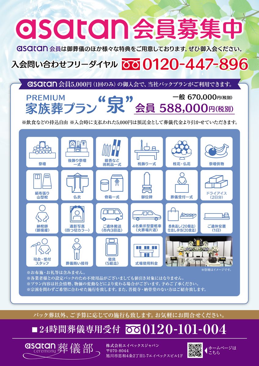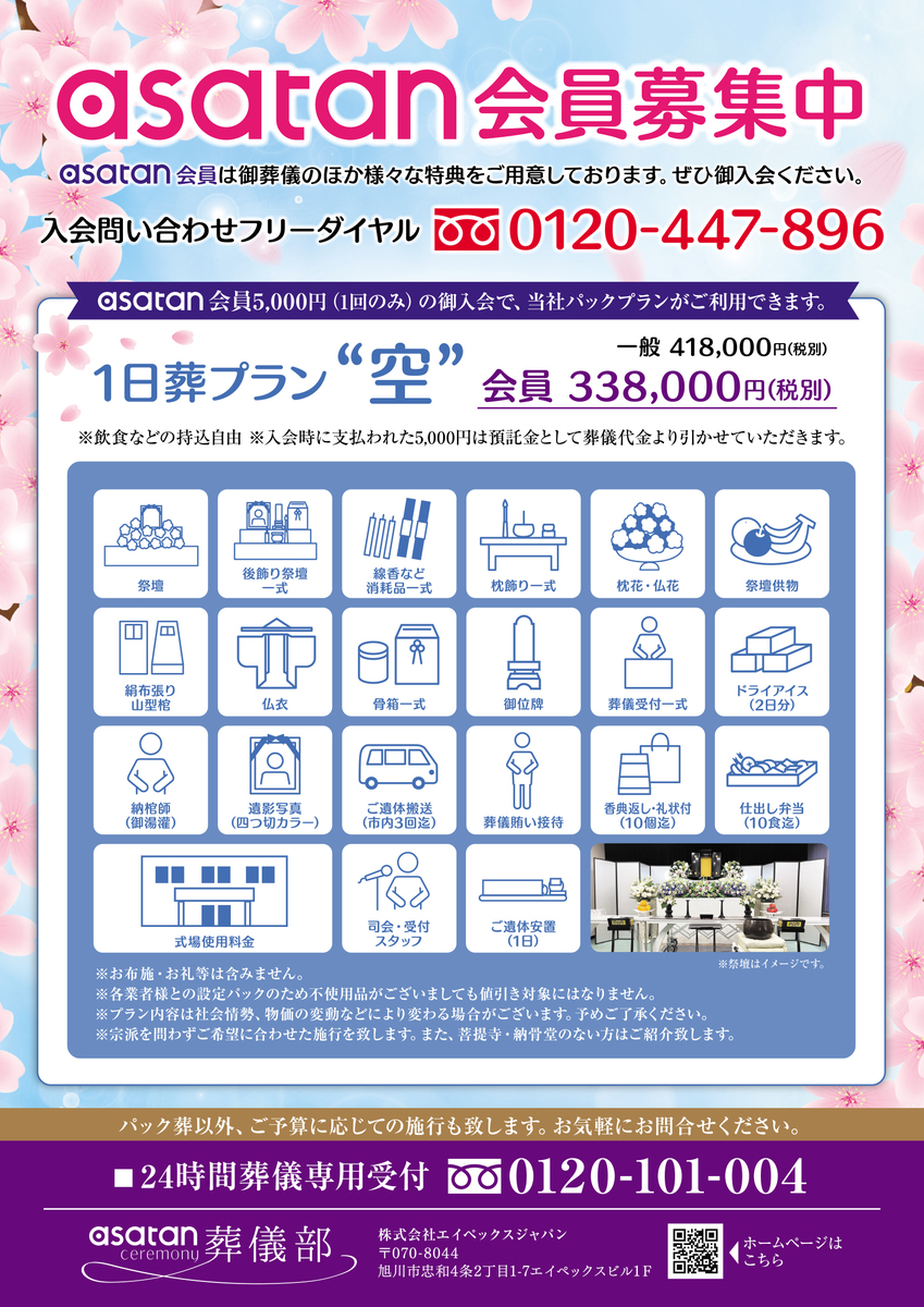 旭川市に、安心価格の火葬式プランをメインとした『asatan葬儀部』がオープンしました。