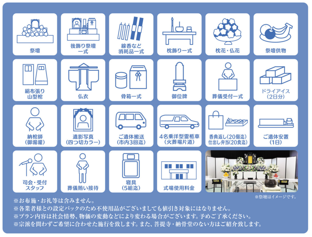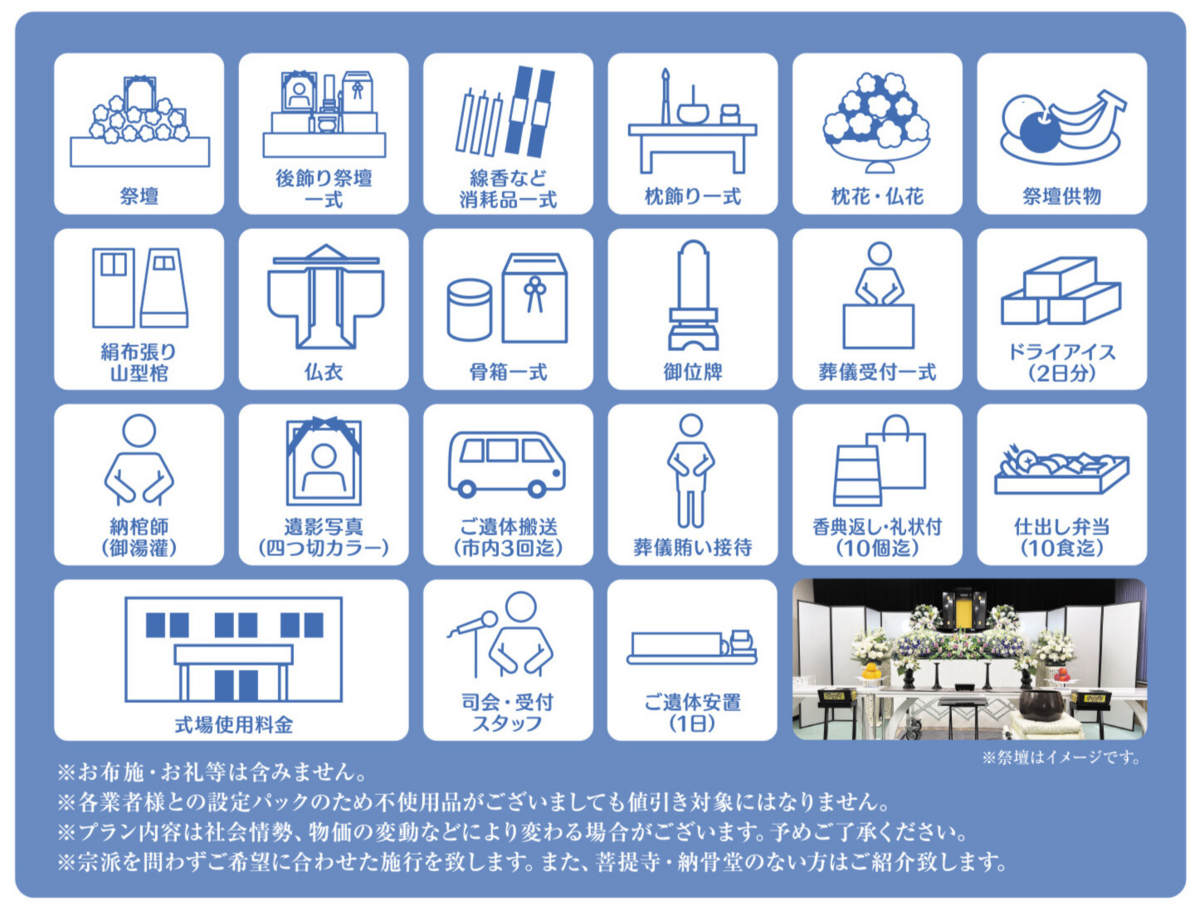 1日葬プラン『空』は、式場使用料金からご遺体安置、ご遺体搬送、香典返し、仕出し弁当など一通り必要なものが揃ったプランになっています。