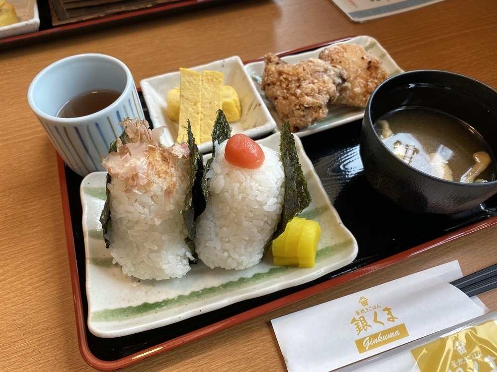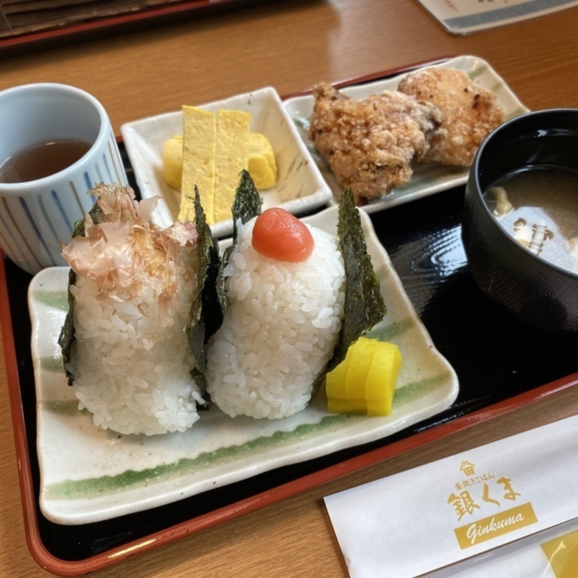 「釜炊きごはん 銀くま」の「おにぎりセット」は、大きなおにぎりが2個、お味噌汁、唐揚げと玉子焼きがセットになった定食です。