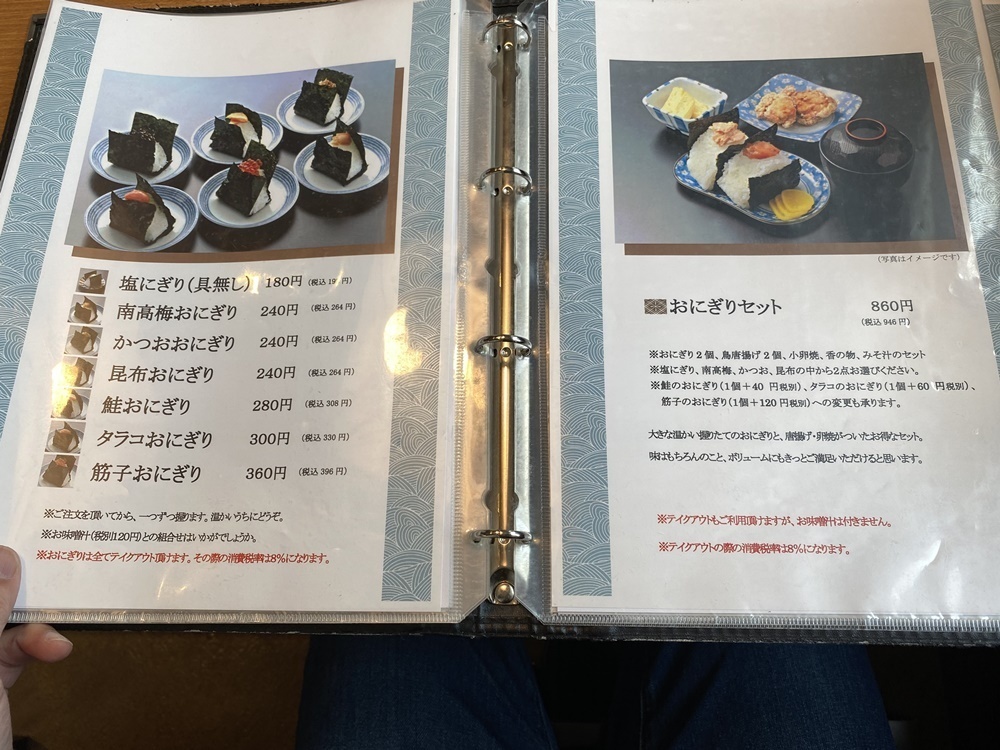 基本価格の860円(税別)では、塩にぎり・南高梅・かつお・昆布の中から2個を選べますが、追加料金で鮭・たらこ・筋子に変更もできます。