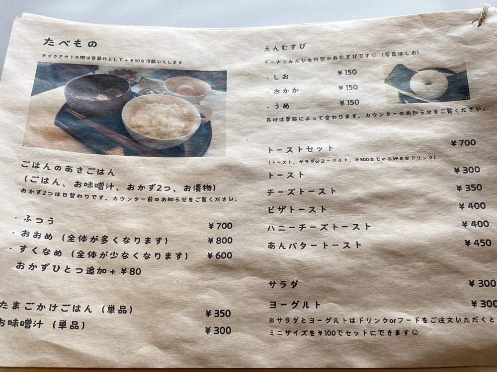 日替わりのおかずは、カウンターに置かれたホワイトボードに書かれていました。この日は、「たまごかけ」「納豆」「こんにゃくと天ぷらかまぼこの煮物」「厚揚げとチンゲンサイのオイスターソース炒め」の4種類です。