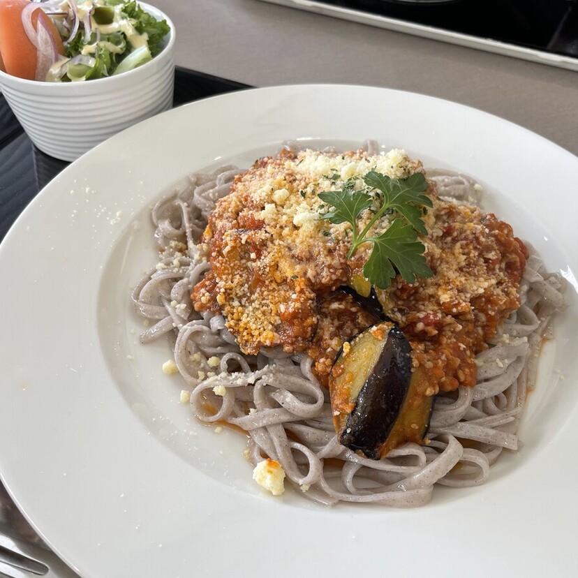 黒米パスタは平麺でもっちりと香ばしく、トマトとひき肉がたっぷりと入ったコクのあるミートソースは、トマトの旨味がしっかりと出ていて、ゴロっとしたナスもソースに絡めて一緒に食べるとさらにうま味アップ!!