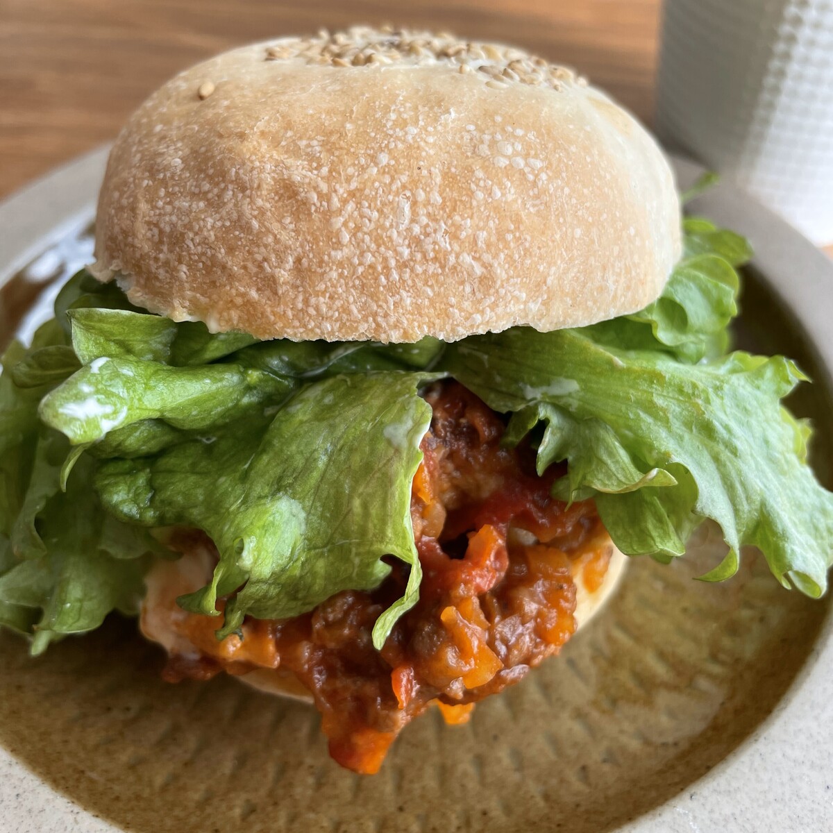 ちょっぴりハード系の小麦の香りがいいかりっともっちりバンズに、その場でじゅーっと焼いてくれるジューシーなハンバーグには、うま味たっぷりの自家製のトマトソースが、食べるたびにこぼれ落ちるほどたっぷりと入っています♪