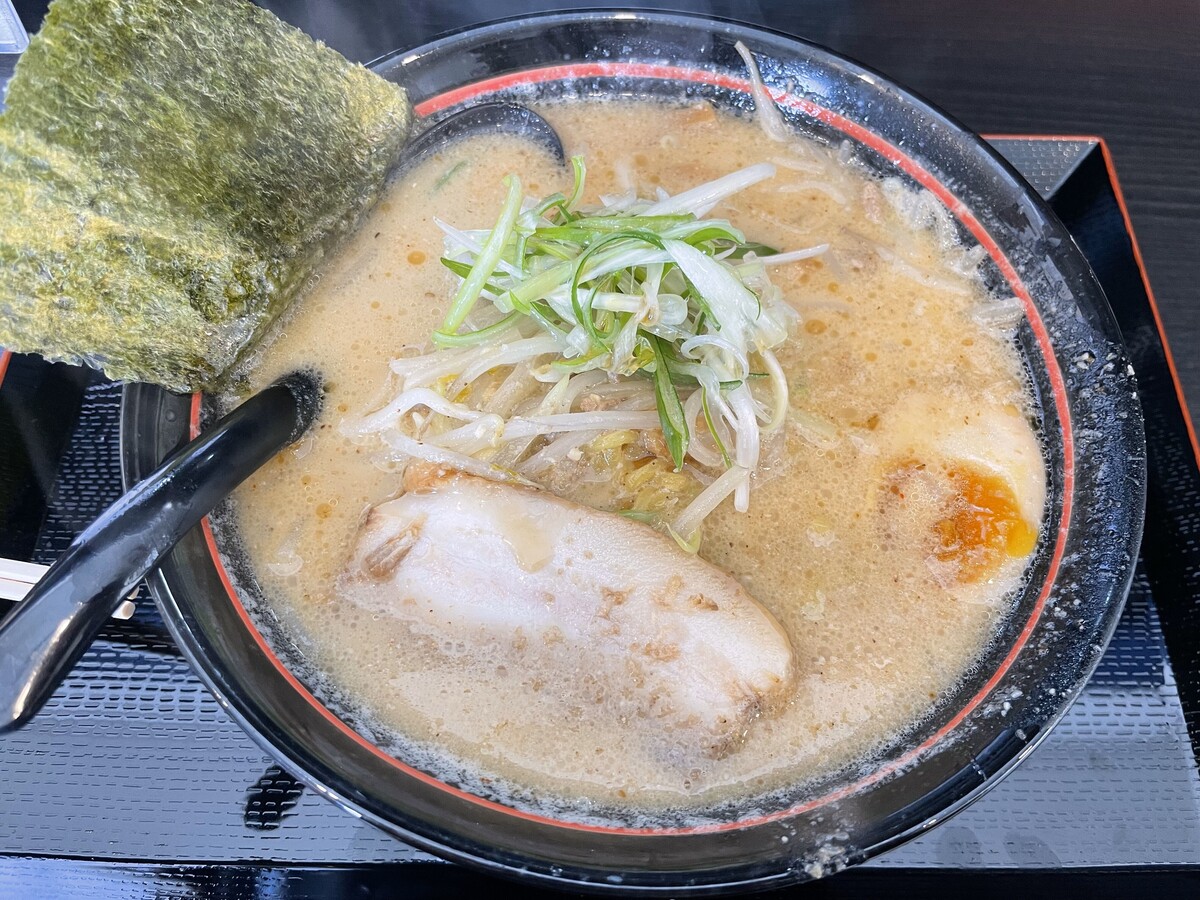 濃厚なこってりとしたコクのあるスープで、麺は中太ちぢれ麺。もやしやネギもたっぷりと入っていてとってもボリューミー。