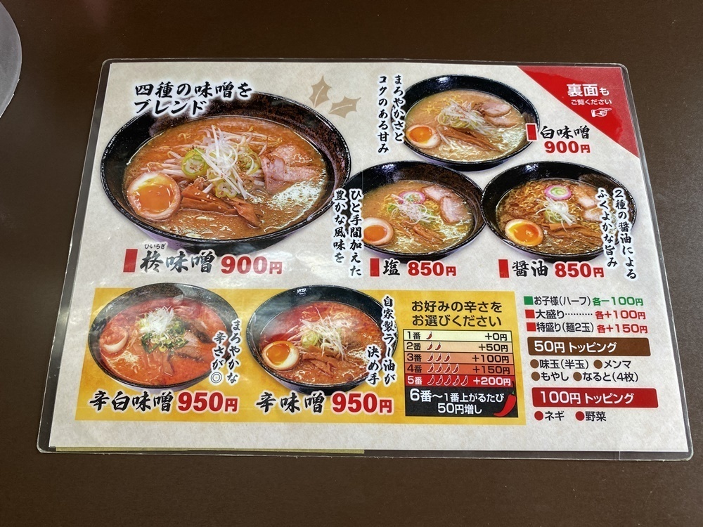 味噌ラーメンがおすすめのようで、お品書きには店名が付いた「柊味噌」の他、白味噌、辛味噌、辛白味噌といった4種類の味噌ラーメンがあります。