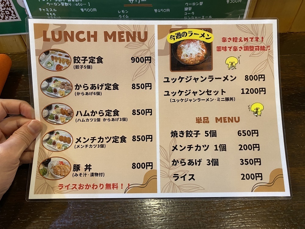 ランチメニューは、餃子など4種類の定食と豚丼、ラーメンです。
