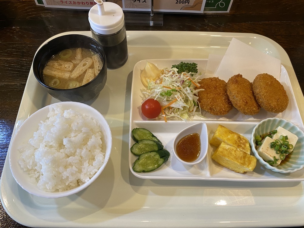 「メンチカツ定食」は、メンチカツが3個にごはんとお味噌汁、そして玉子焼きと冷奴、サラダ、漬物が付いています。
