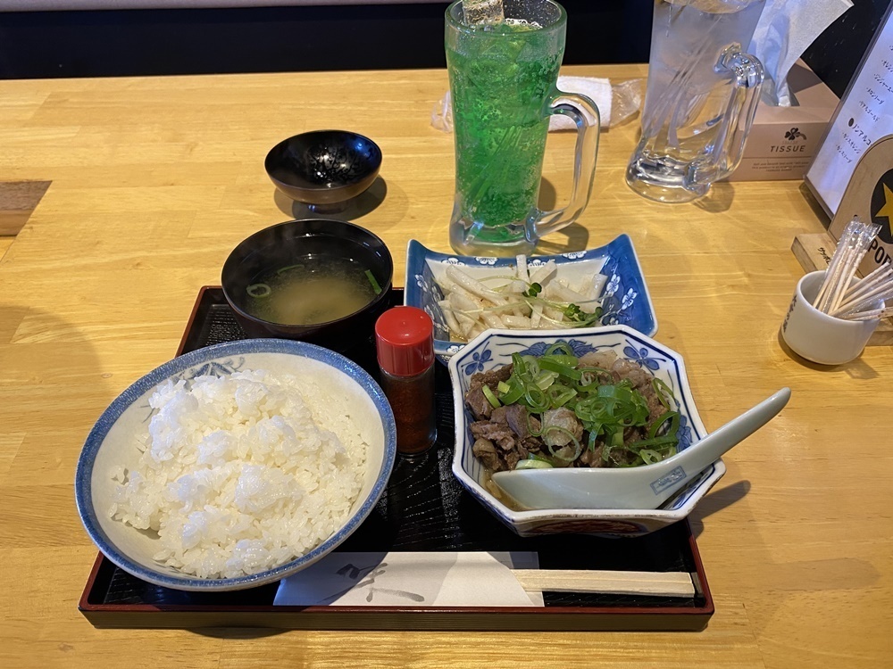 「和風牛すじ煮込み定食」は、ごはんとお味噌汁、大根の和風サラダ、ソフトドリンク付きです。