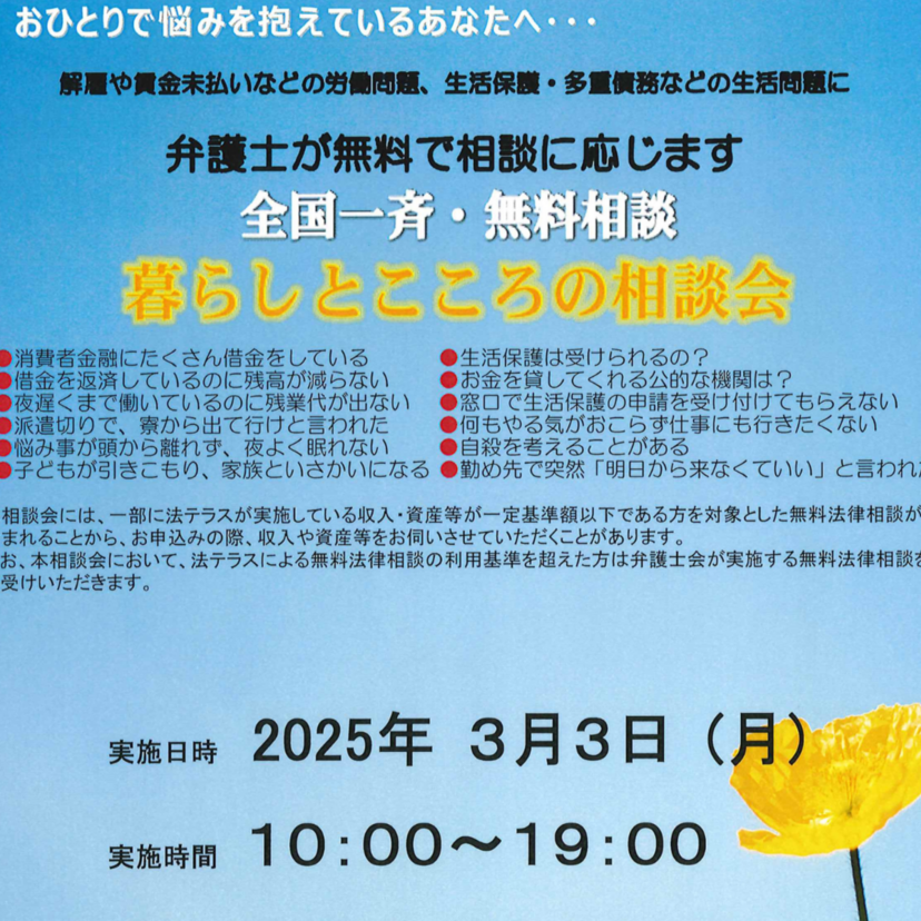 【3月3日】弁護士に無料相談!暮らしとこころの相談会開催