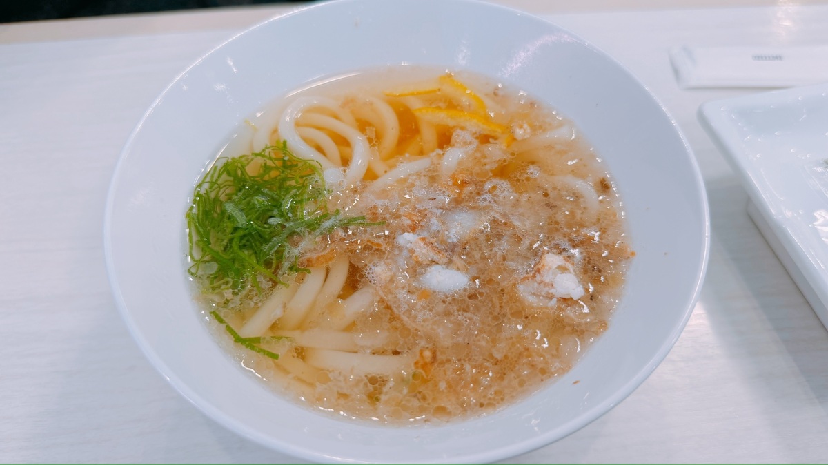 たぬきうどんは170円、大阪発祥!かすうどんは390円です。