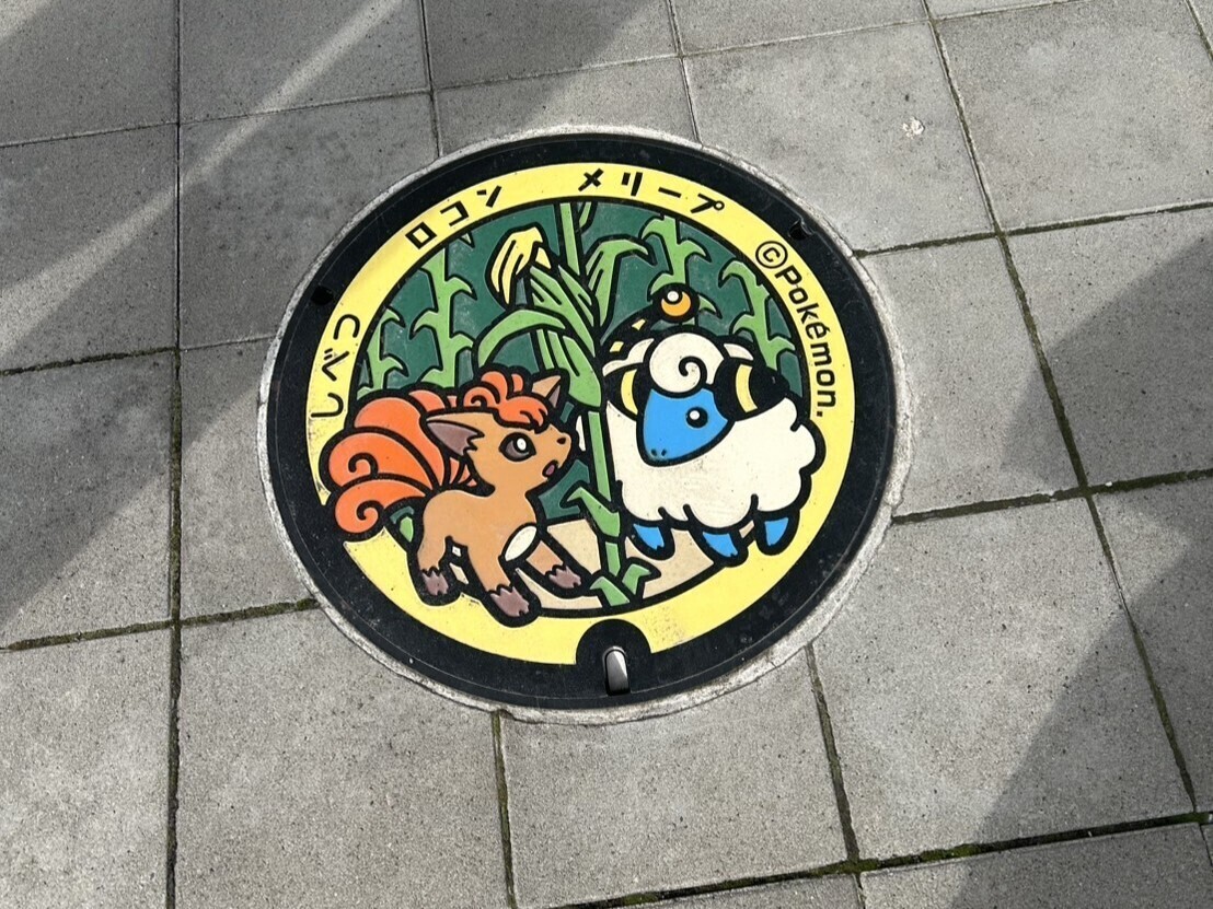 マンホールに描かれているのは、『ロコン』と羊のような形をしたポケモンの『メリープ』。
