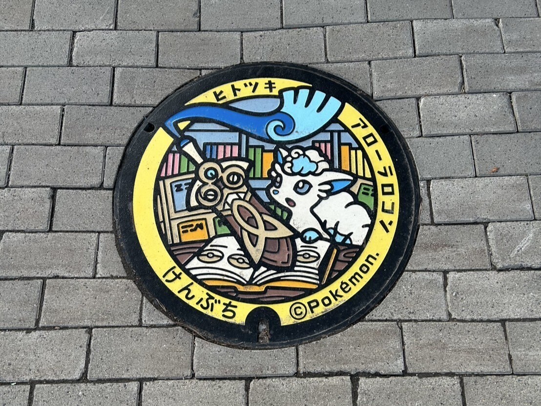 マンホールに描かれているのは、『アローラロコン』にとうけんポケモンの『ヒトツキ』。
