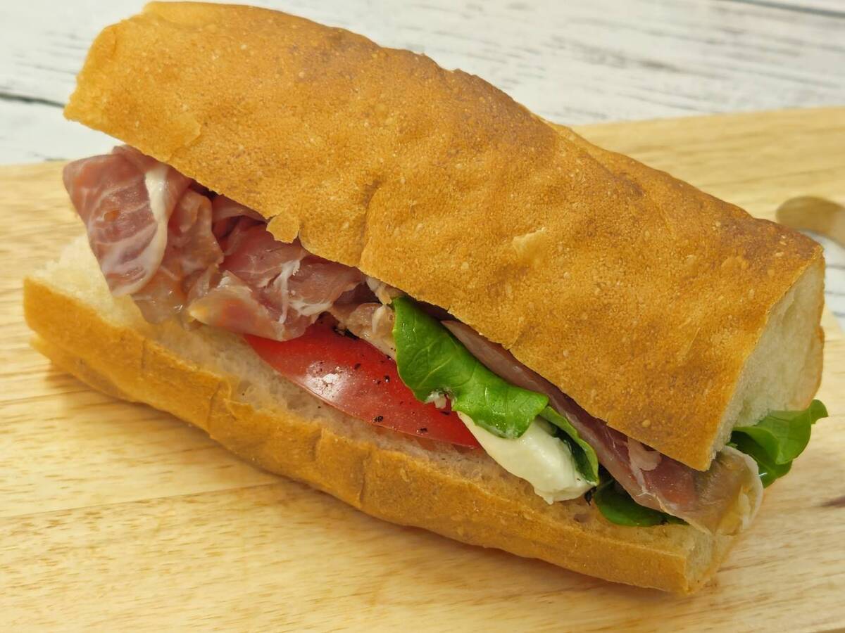 生ハム、クリームチーズ、レタス、トマトがサンドされ、生ハムがたっぷりなので塩味がしっかり。