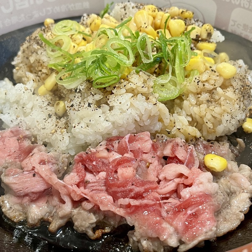 この黒い鉄板とコーンを見ると、「いきなりステーキ」を思い出しますね。