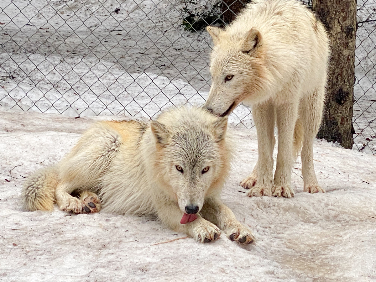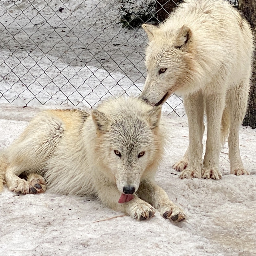 オオカミ犬は、オオカミと犬の交配種。日本ではオオカミ犬やウルフドッグと呼ばれていますが、こちらにいるのは「ノースアメリカンインディアンドッグ」という名前の犬種です。