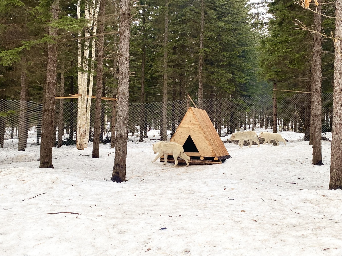 大きな木に囲まれた広い敷地内には、3つの檻があり、10頭のオオカミ犬が展示されています。