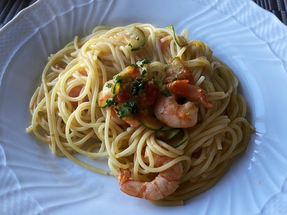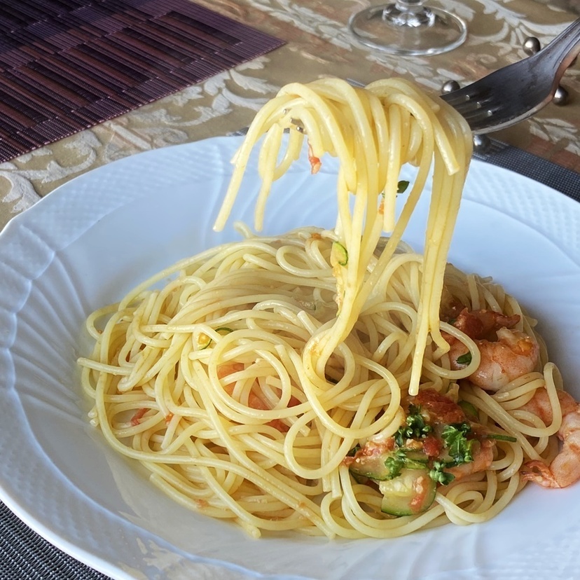 「エビとトマト、ズッキーニ」のスパゲッティというので、トマトソースかと思ったら、オリーブオイルベースで、具材にトマトとエビ、ズッキーニが使われていました。