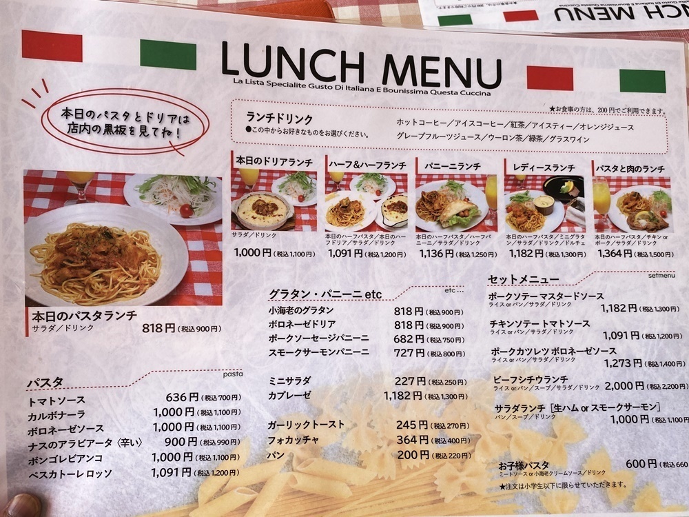 ランチメニューは、本日のパスタランチ・本日のドリアランチ・ハーフ&ハーフランチ・パニーニランチ・レディースランチなどかなり豊富。