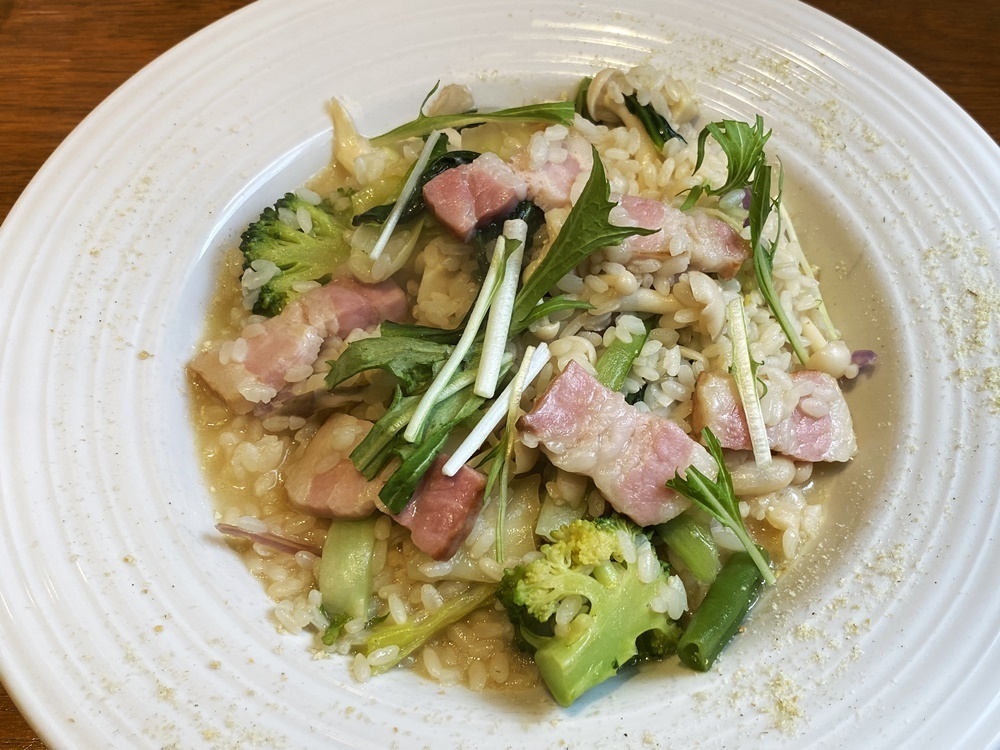 ベーコン、ブロッコリー、しめじ、インゲン、水菜、キャベツ、ほうれん草、豆など、具材がたっぷりのリゾットは、醤油とバターで和風の味付け。
