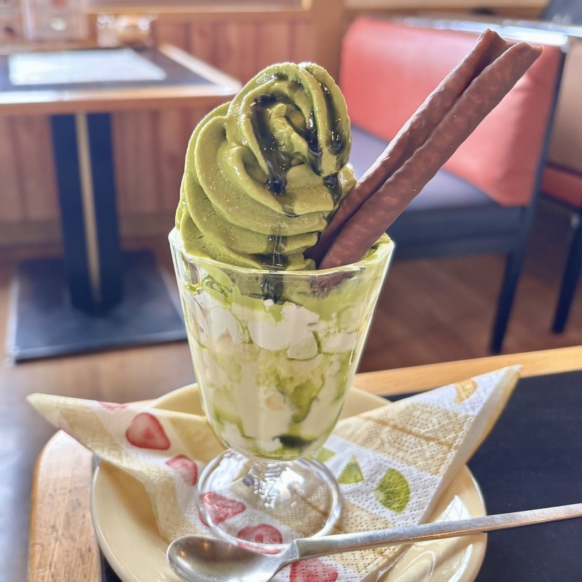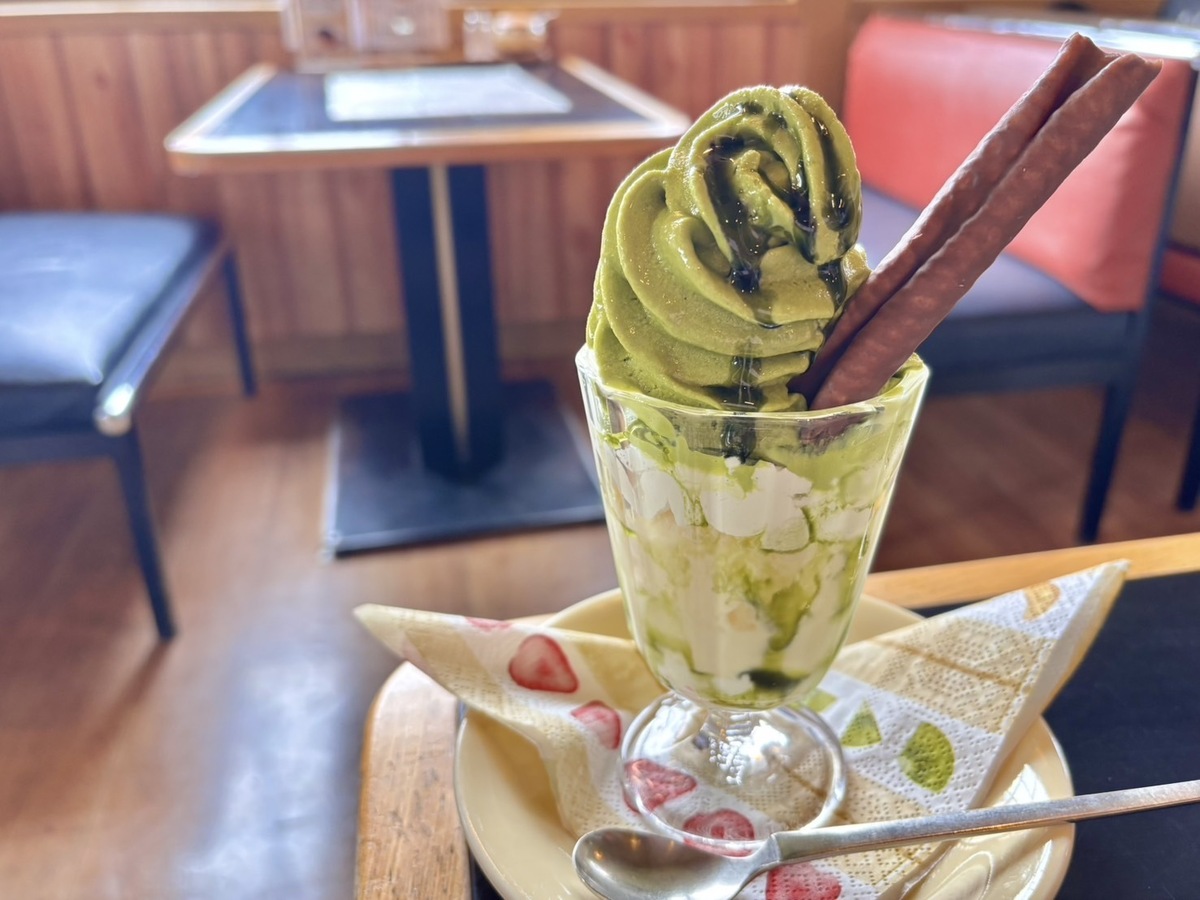ミニサイズと言っても、15センチくらいのグラスに抹茶ソフトがモリモリ!!