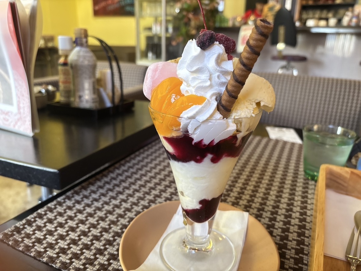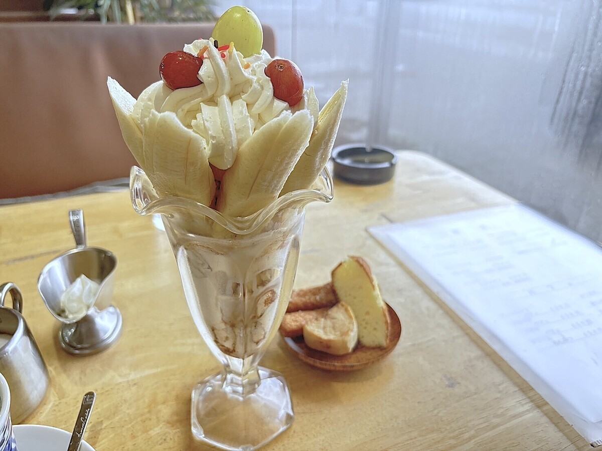アイスがマーブルチョコレート味のアイスクリームで、その上に1本は使われているだろうバナナ、桃、ぶどう、クリームが乗っていました。
