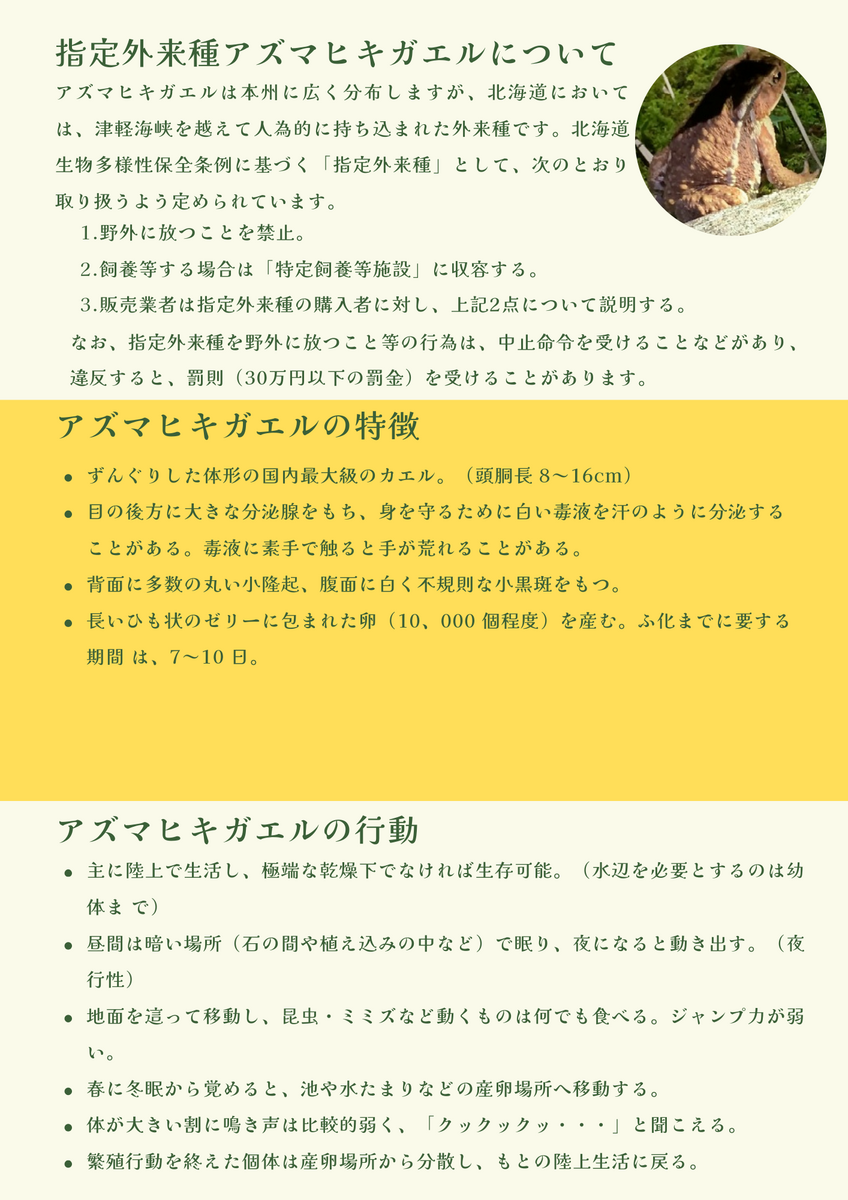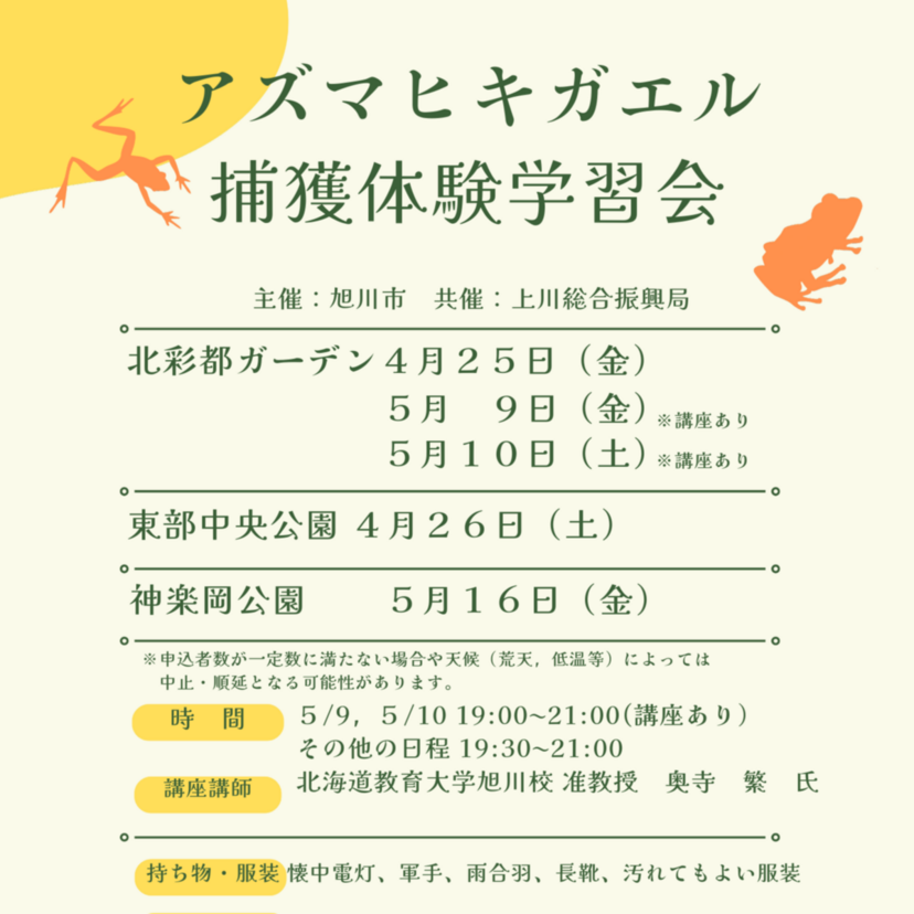 2025年4月25日(金)に旭川市の北彩都ガーデンで『アズマヒキガエル捕獲体験学習会』が開催されます。