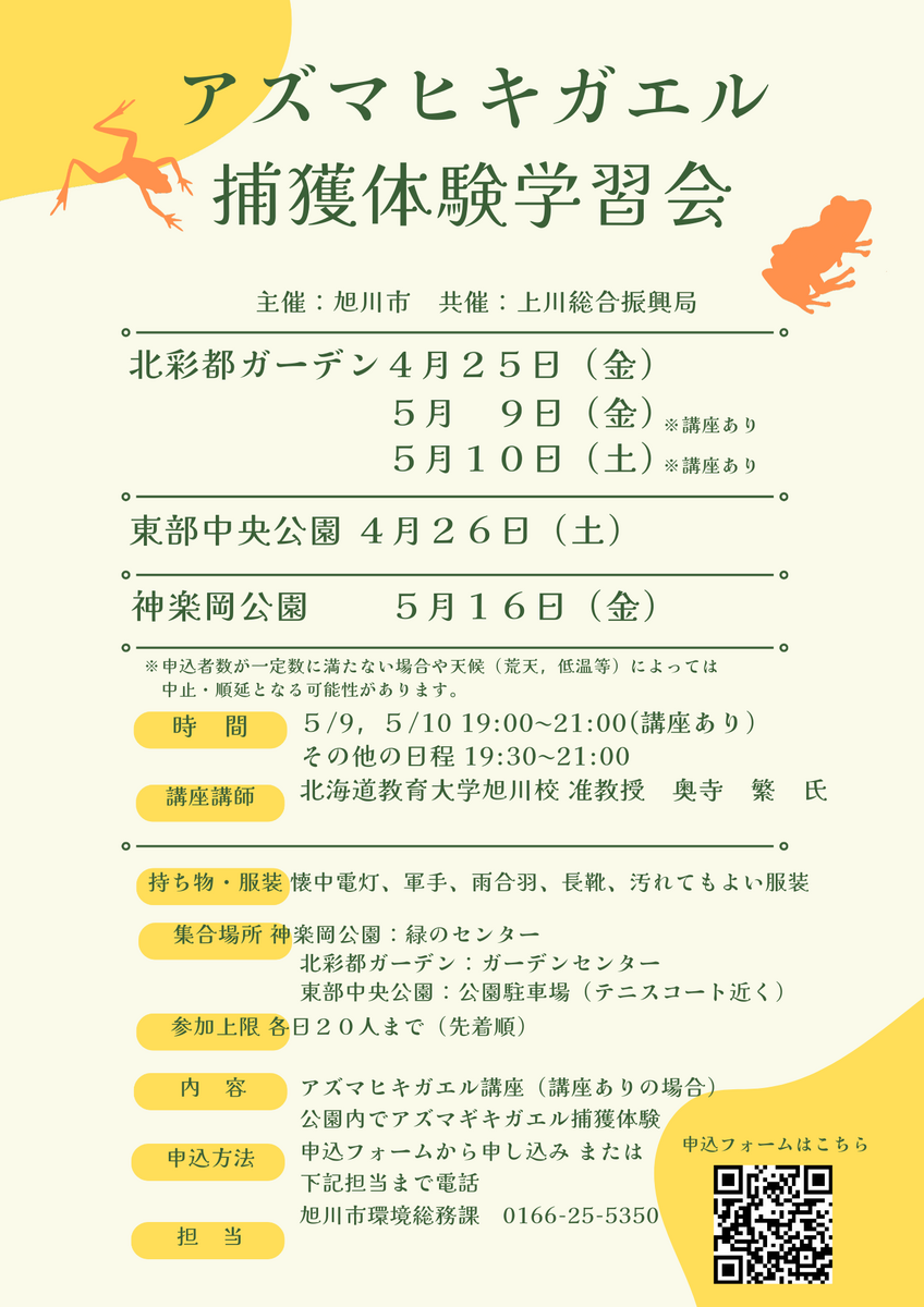 指定外来種のアズマヒキガエルを捕獲する体験学習で、4月25日(金)のほか、北彩都ガーデンでは5月9日(金)、5月10日(土)に、東部中央公園では4月26日(土)に、神楽岡公園では5月16日(金)に開催されます。