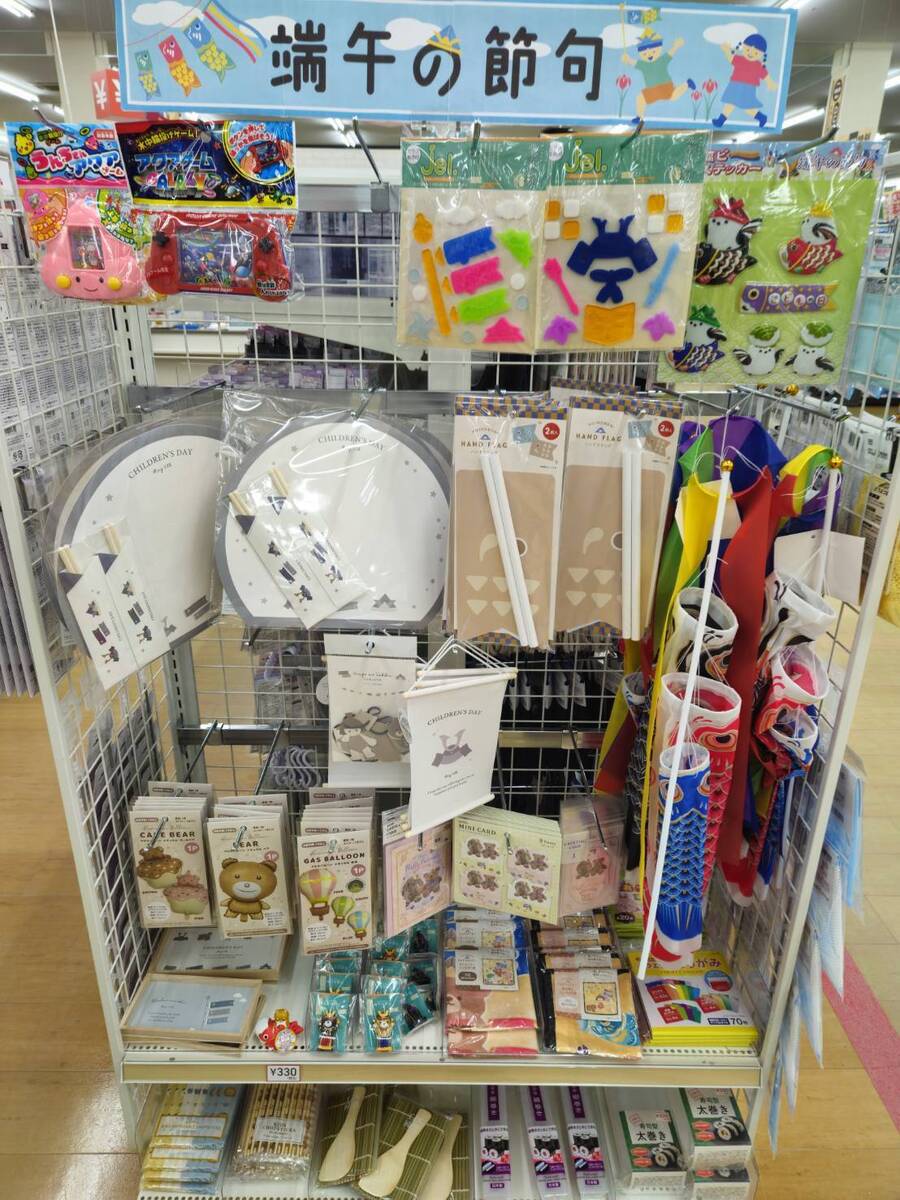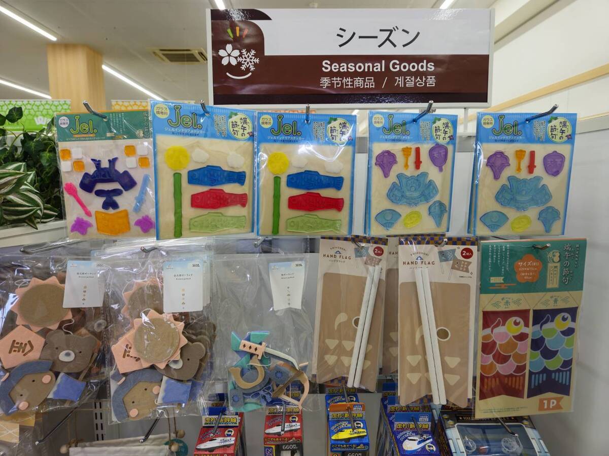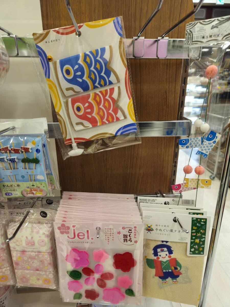キャンドゥでは壁に貼るおもちゃやこいのぼり、小物も販売しています。