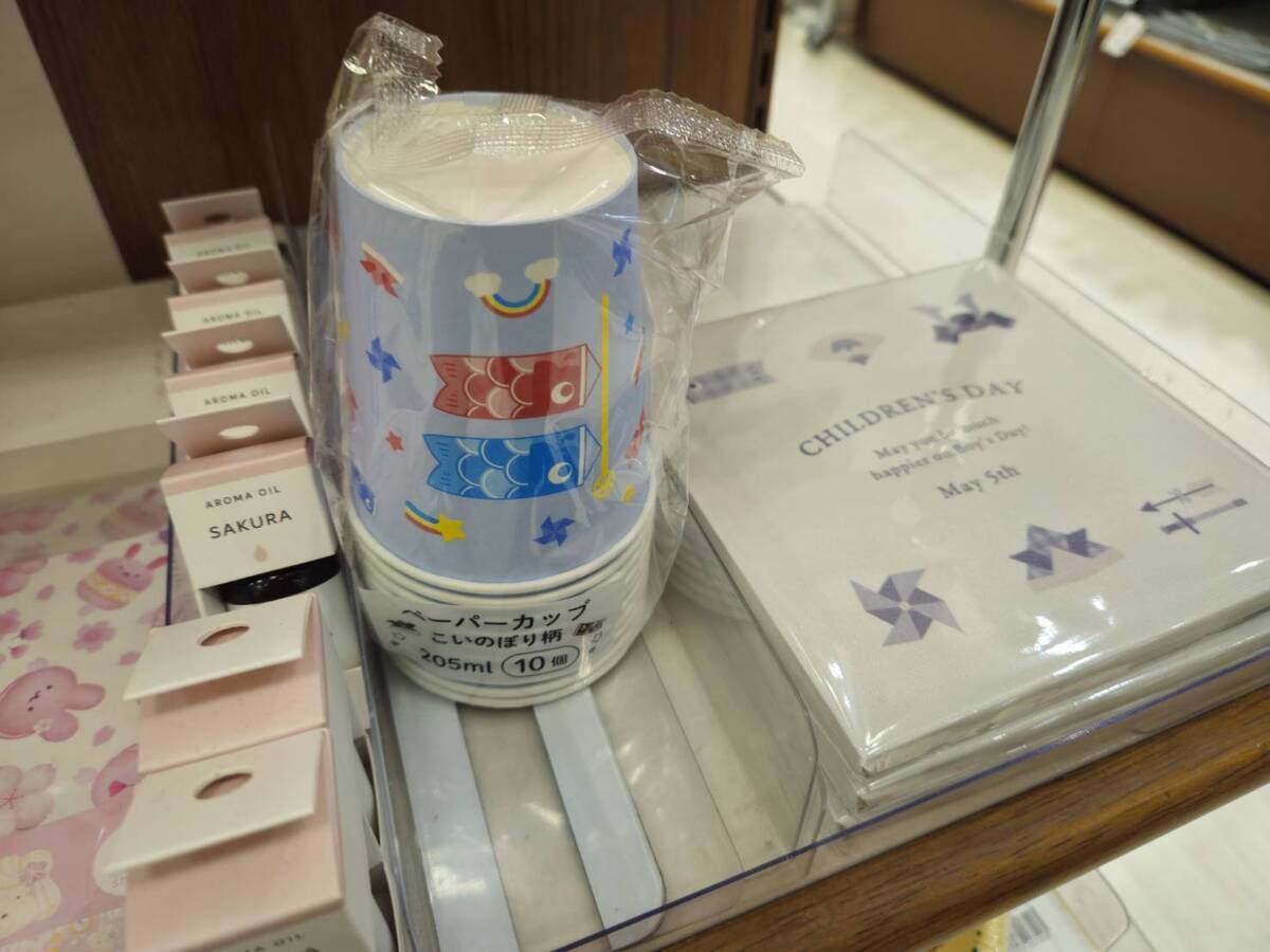 セリアでは小さなこいのぼりや紙コップ、かんざしなどを販売。