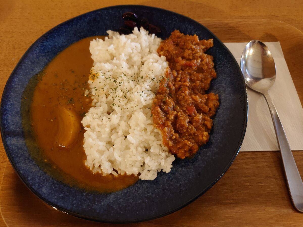 「キーマカレー」と「たまねぎカレー」のあいがけ。