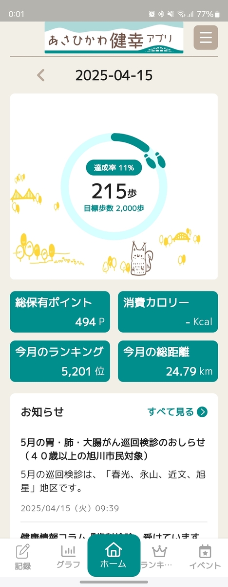 ホーム画面では、現在の総保有ポイントや、消費カロリー、今月のランキング、今月の総距離などが表示されます。