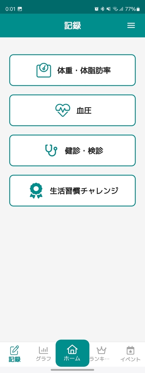 記録ページでは体重・体脂肪率、血圧、健診・検診、生活習慣チャレンジの確認ができます。