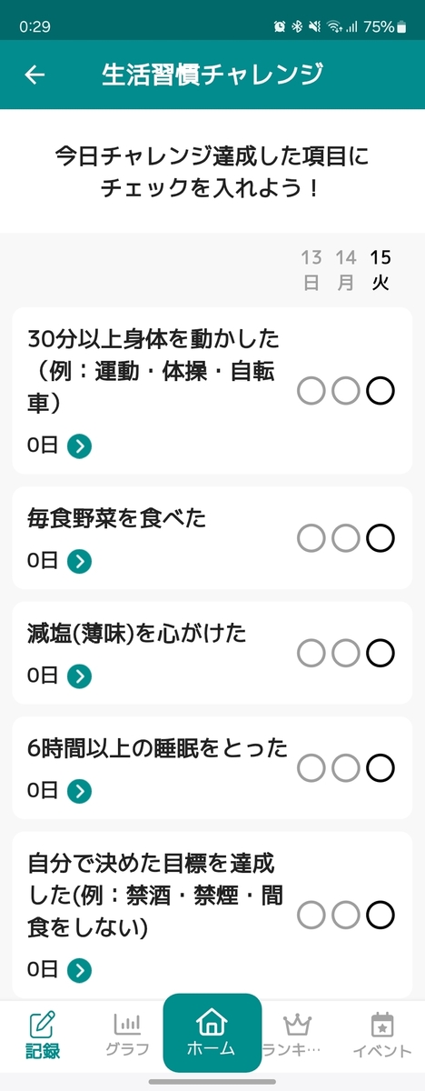 生活習慣チャレンジでは、その日の記録としていくつかの項目にチェックすることができます。