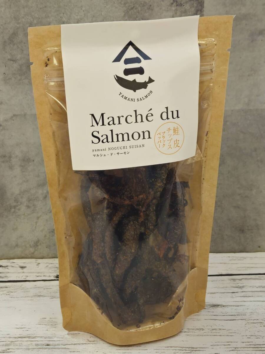 お洒落なパッケージと、よく販売されている鮭皮チップスとは違う黒っぽい見た目が特徴。