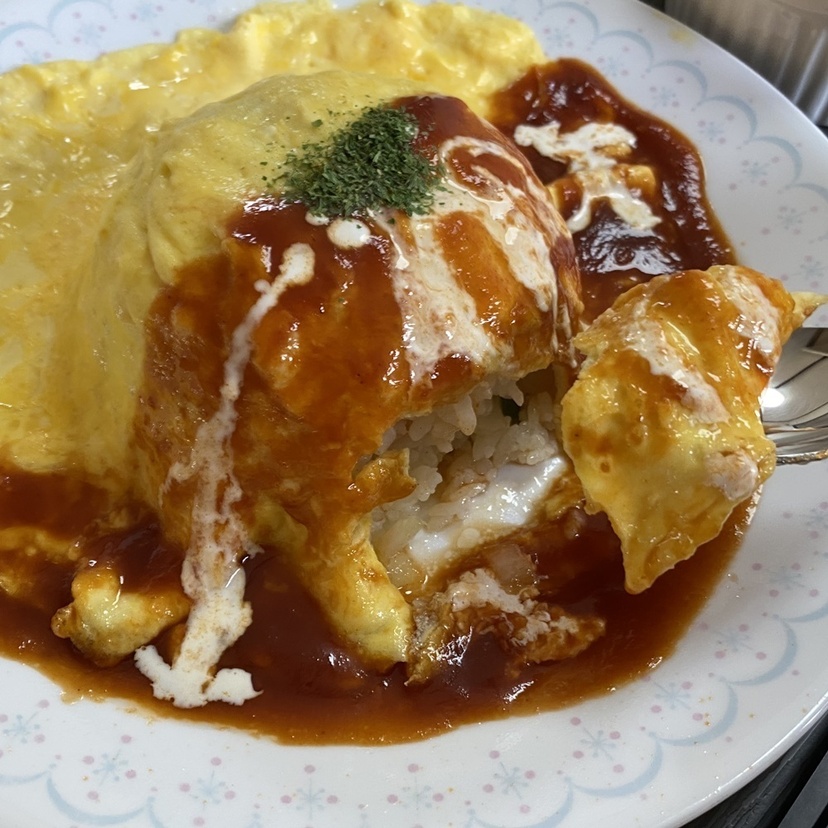 ガーリックライスのオムライスって珍しいですよね。ガーリックライスと甘めのデミソースのバランスが良くてとてもおいしかったです。