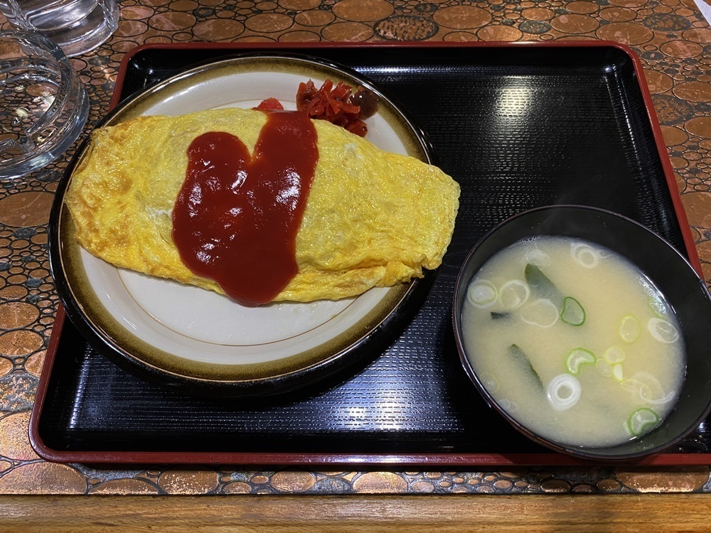 出てきた「オムライス」は、ケチャップライスをたまごで包んだレトロスタイル。福神漬けやお味噌汁が付いているところが昭和という感じがしますね。