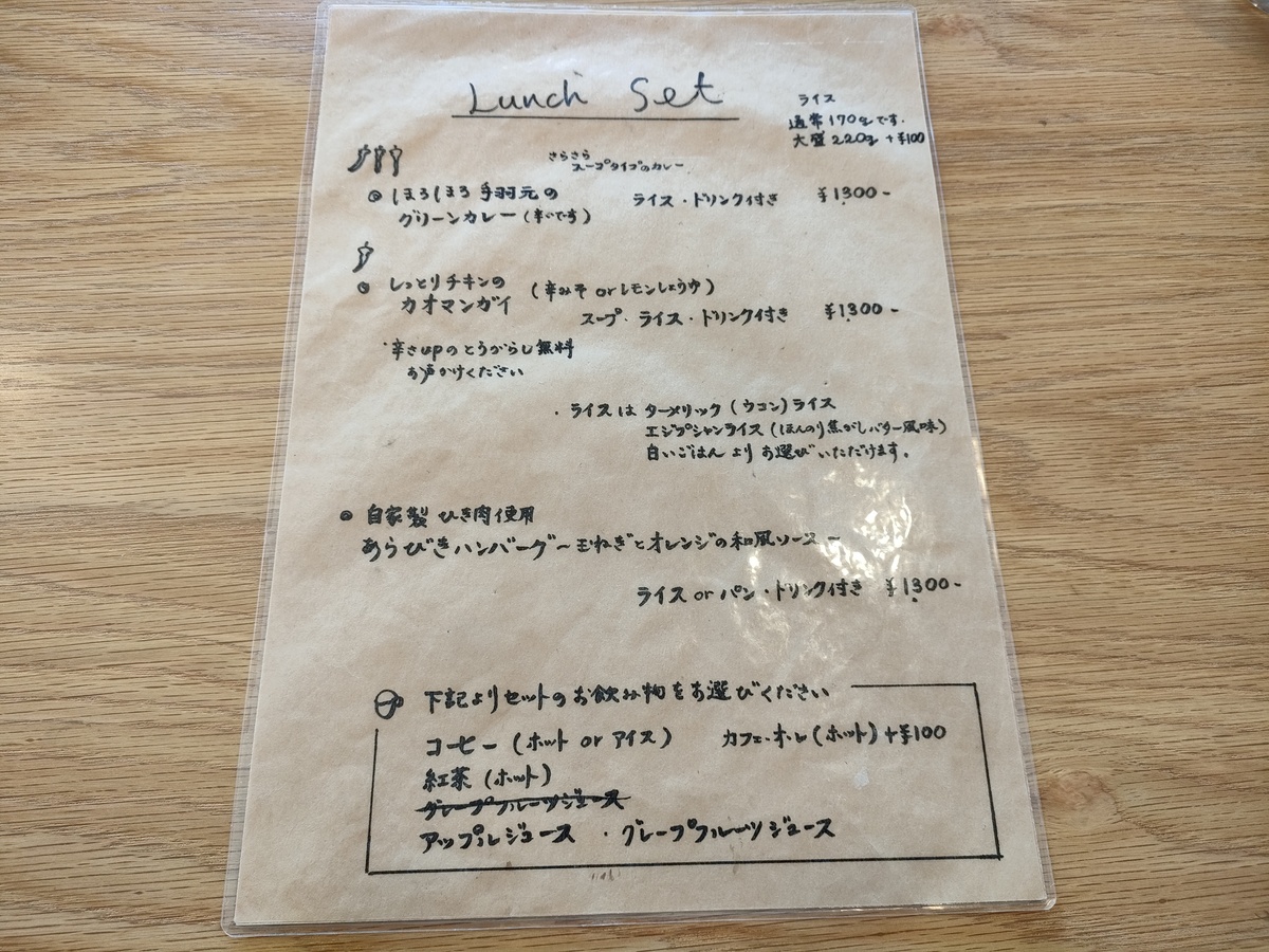 ランチメニューは上の写真の通り、グリーンカレー、カオマンガイ、あらびきハンバーグの3種類。