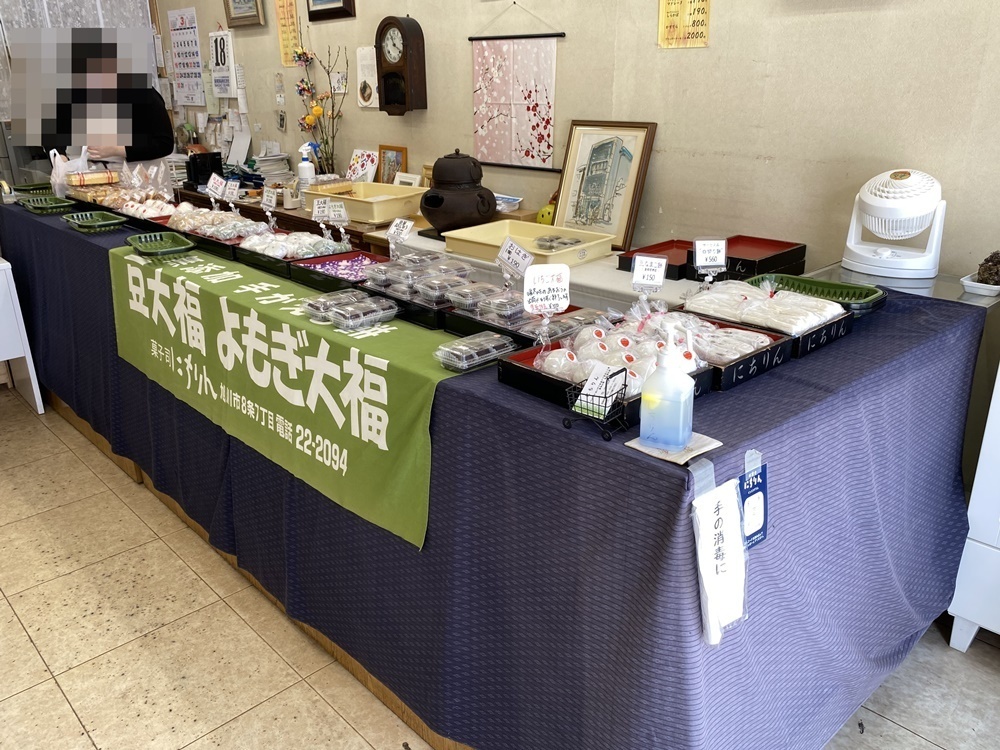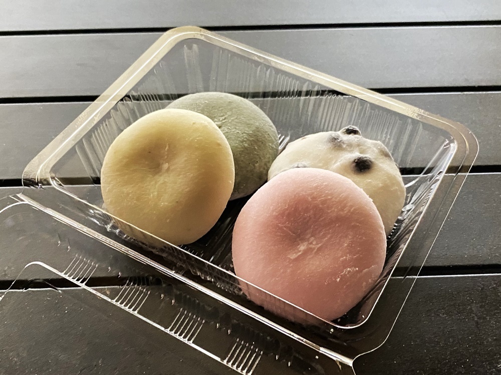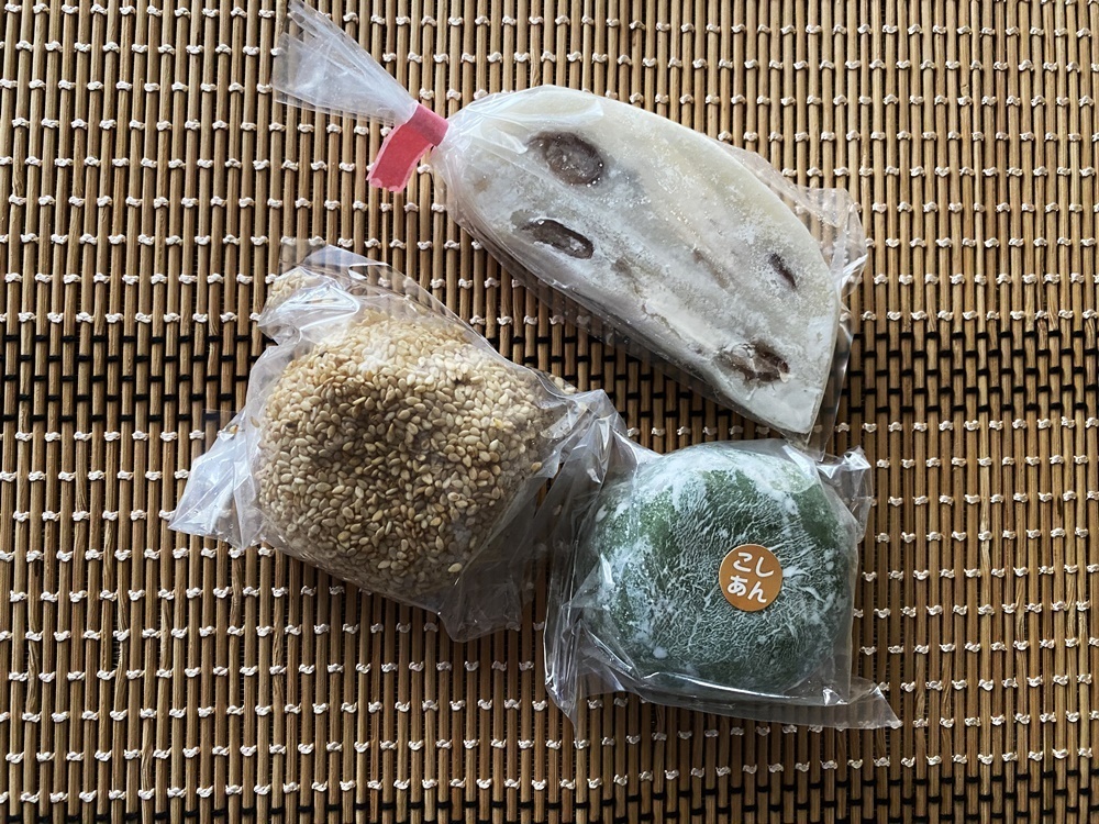 この日購入したのは、よもぎ大福とごま大福、豆なまこ餅。