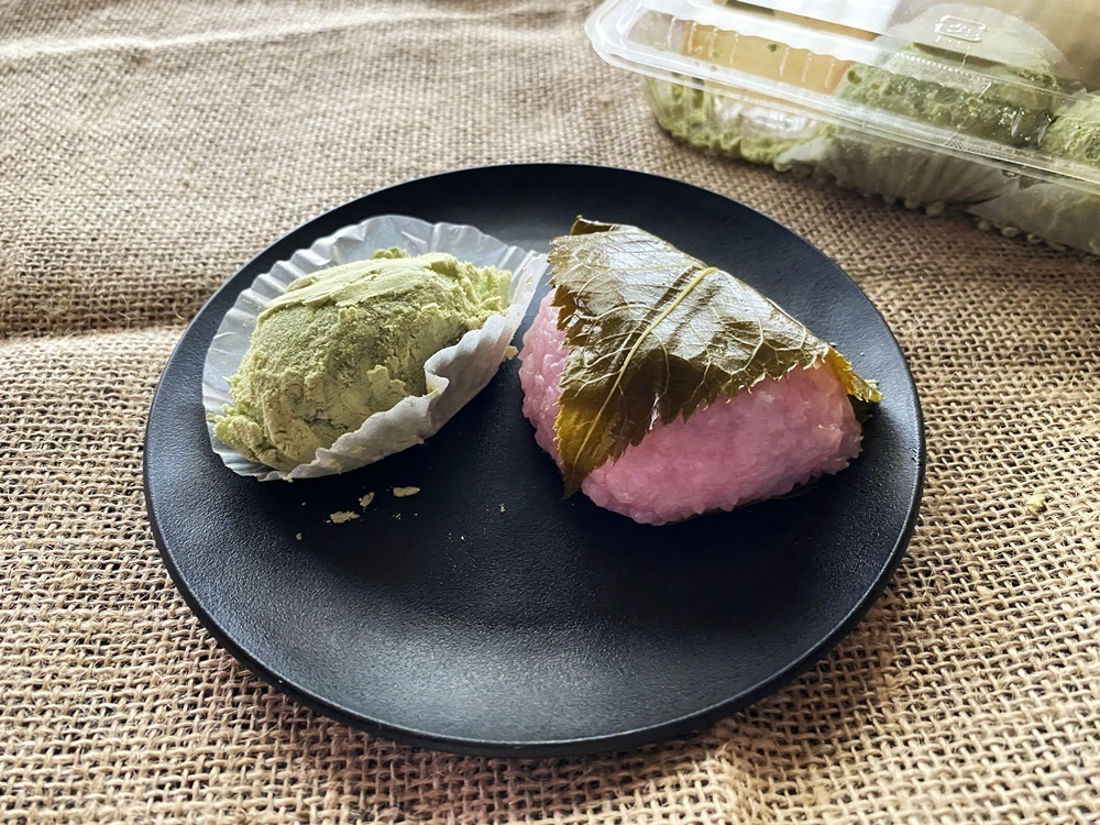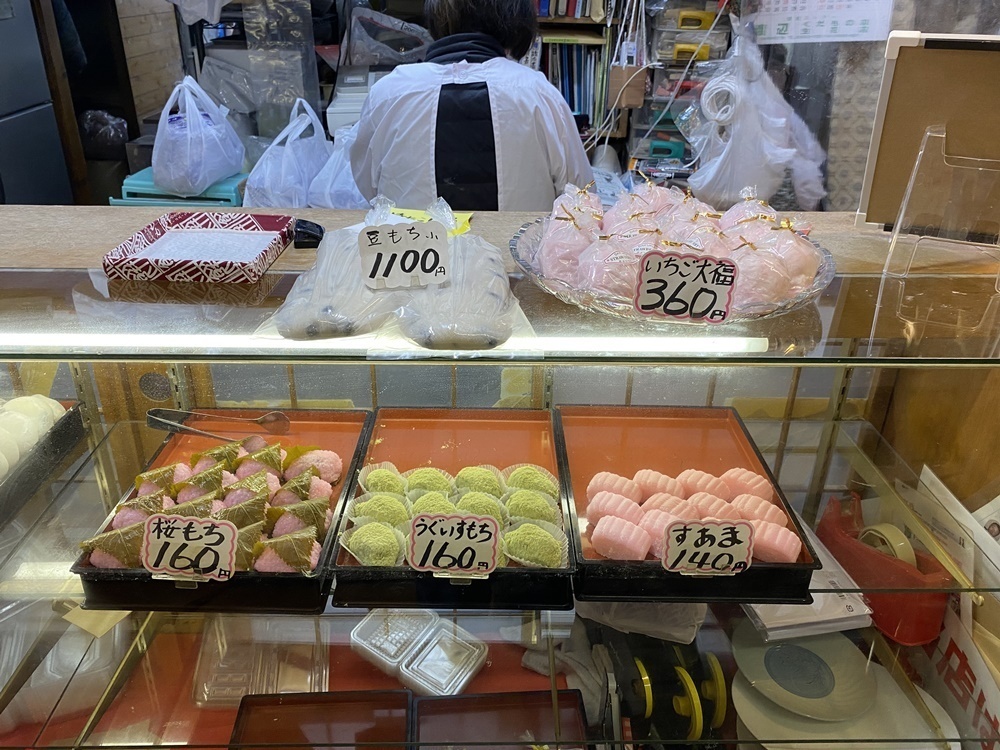 この日は午前11時前に行ったので、まだ「いちご大福」も並んでいましたが、購入したのは春が感じられる「桜もち」と「うぐいすもち」です。