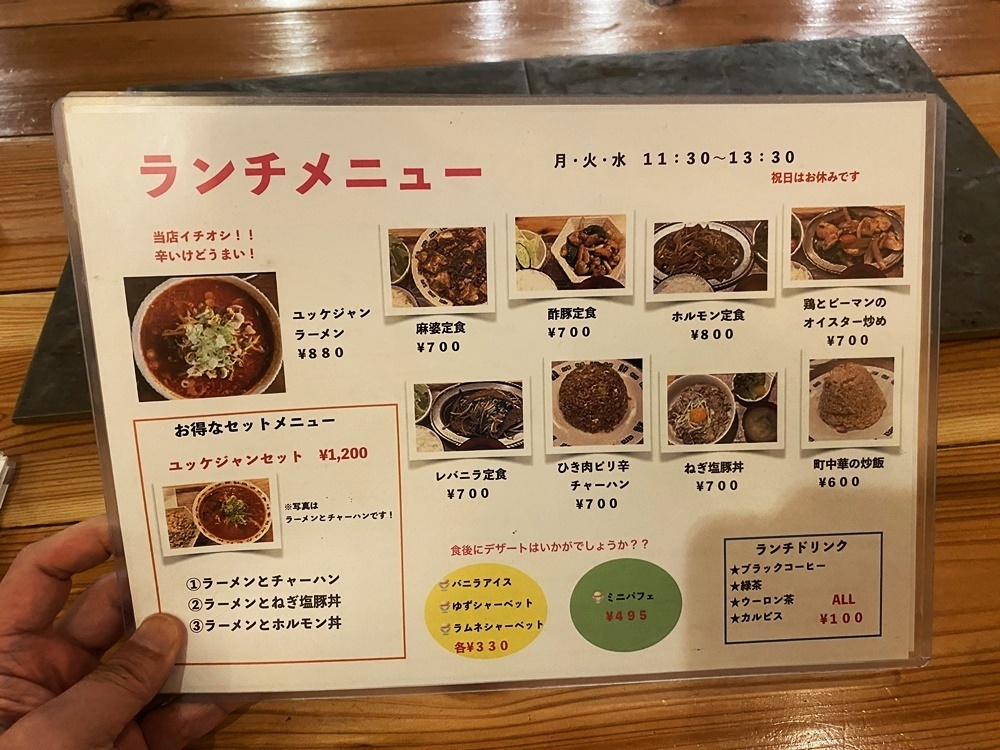 ランチメニューは、麻婆や酢豚、ユッケジャンラーメンなど中華系の料理が9種類。