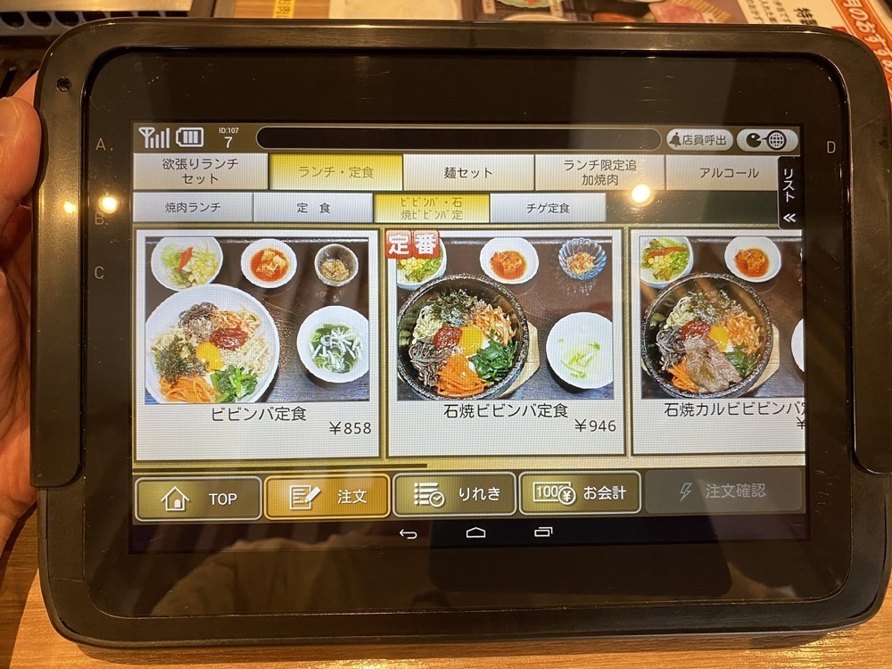 間違って同じものを2つ注文してしまい、店員さんを呼ぶことに。すったもんだありながらも、定番と書かれた「石焼ビビンバ定食」を無事に注文できました。