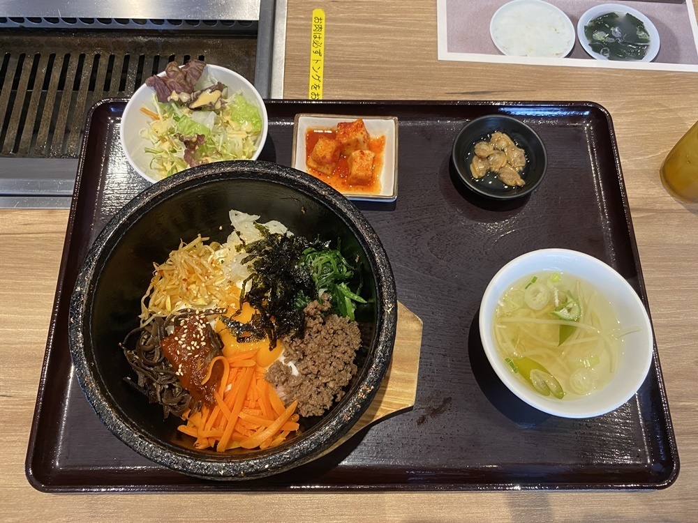 メインの「石焼ビビンバ」は、肉や野菜などが彩り良く盛り付けられています。