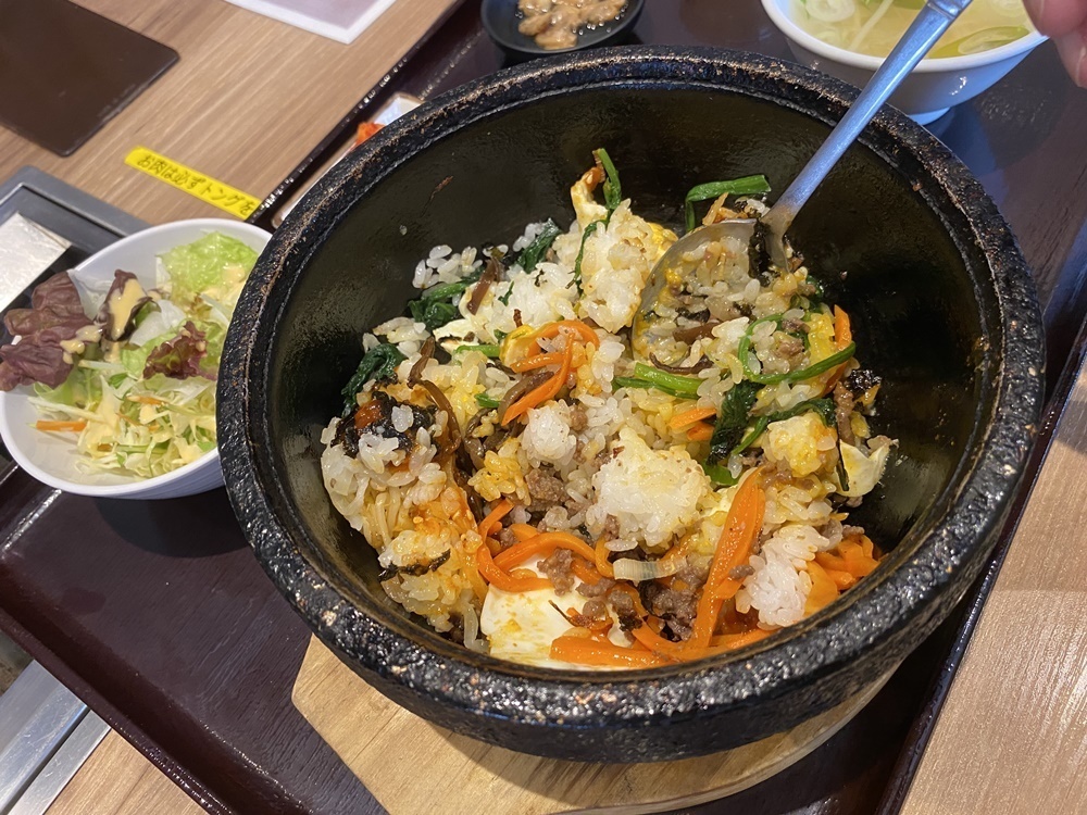「石焼ビビンバ」は、この混ぜる作業が楽しみでもあり、おいしく食べるために必要な工程ですね。