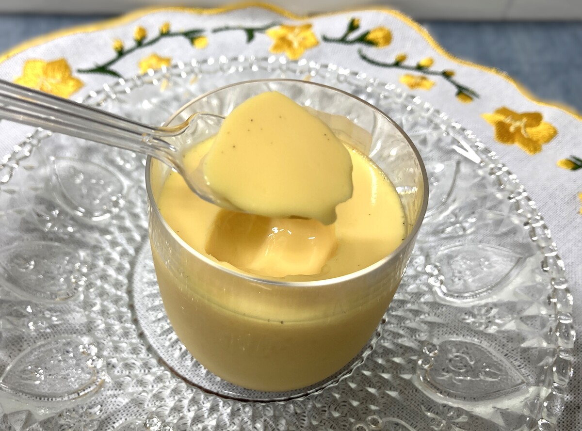 とろとろのクリーム系のプリンで、下にはカラメルソースがたっぷり。