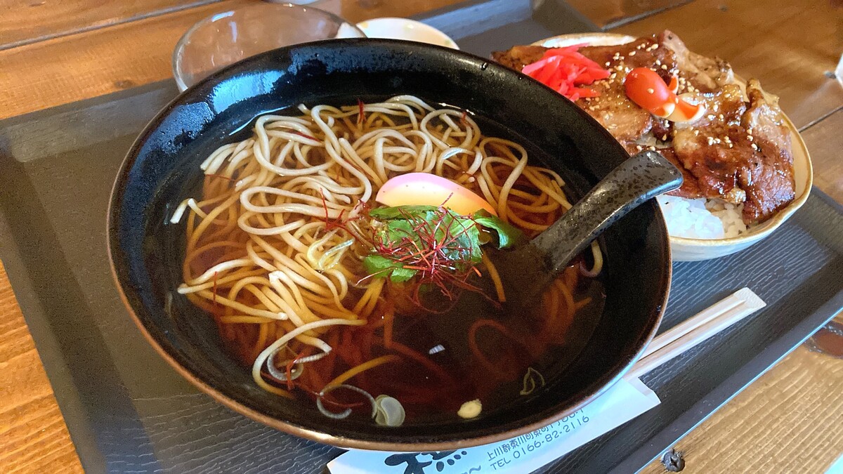 「道の駅ひがしかわ・道草館」の裏手の角にある、お蕎麦と豚丼のお店です。