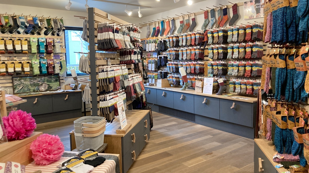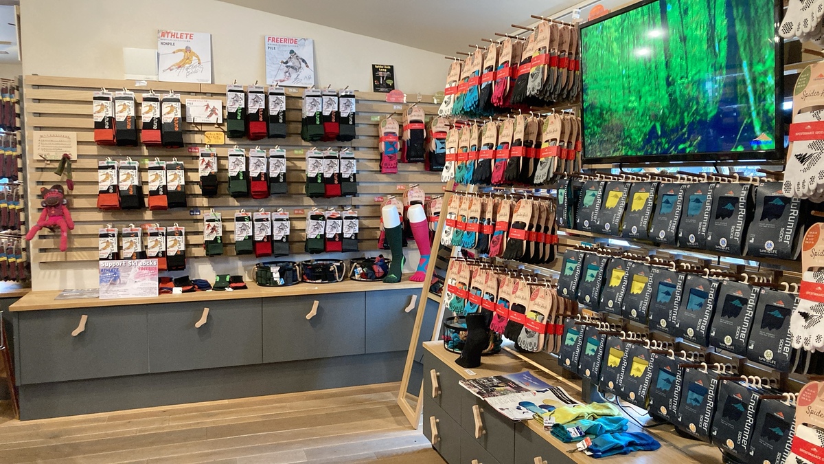店内には、ランニング用、ハイキング用、スキー用など、スポーツ向けのサポート機能付き靴下をはじめ、普段使いできる高品質な靴下が種類豊富に並んでいます。