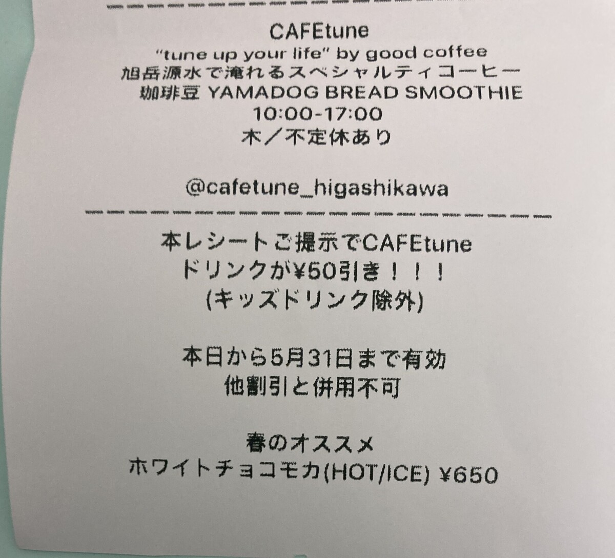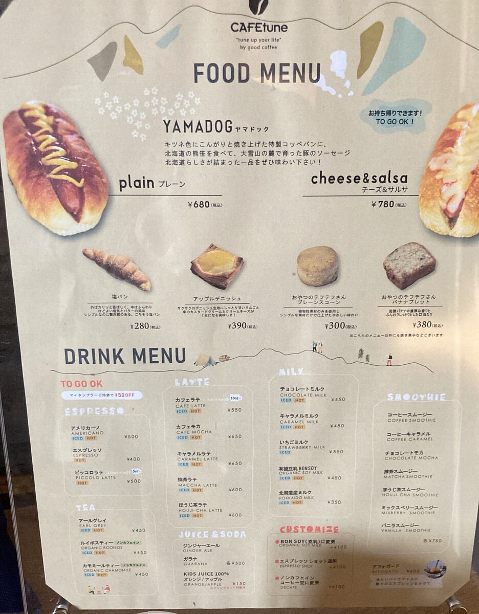 お店の隣には系列のカフェ「CAFEtune(カフェチューン)」もあり、YAMAtuneのお買い上げのレシート提示でドリンクが割引になるサービスがあります。